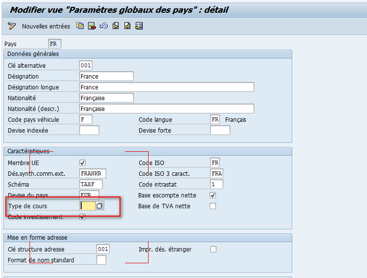 Solution: vous devez compléter votre paramétrage en indiquant un type de cours pour tous les pays déclarants comme indiqué ci-dessous :